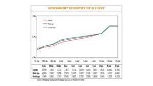 Government debt yields declined by an average of 4.54 basis points (bps) week on week based on PHP Bloomberg Valuation Service (BVAL) reference rates as of Oct. 17. Trading volume dropped to P50.28 billion on Friday from P148.2 billion a week earlier.