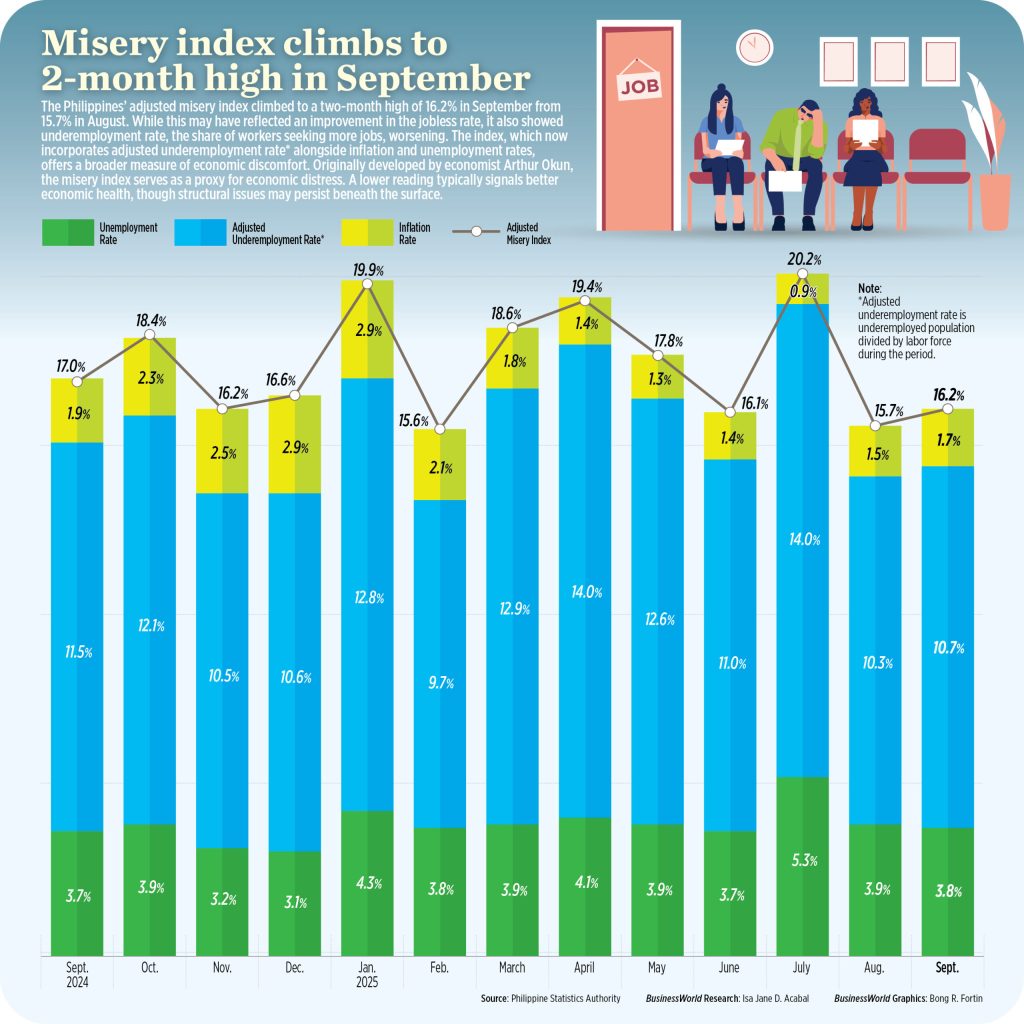 The Philippine’s adjusted misery index climbed to a two-month high of 16.2% in September from 15.7% in August. While this may have reflected an improvement in the jobless rate, it also showed underemployment rate, the share of workers seeking more jobs, worsening. The index, which now incorporates adjusted underemployment rate* alongside inflation and unemployment rates, offers a broader measure of economic discomfort. Originally developed by economist Arthur Okun, the misery index serves as a proxy for economic destress. A lower reading typically signals better economic health, though structural issues may persist beneath the surface.