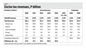 For tobacco products, there has been a consistent over-projection yearly: P54 billion in 2020, P27 billion in 2021, P39 billion in 2022, P109 billion in 2023, and P61 billion in 2024 (see Table 1).