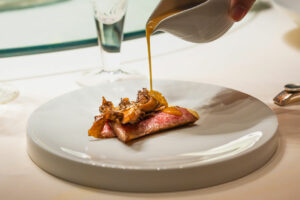 For the last of the savories, he served Wagyu with Maitake (dancing mushrooms), served with an onion-based soubise. We already had some expectations about how this should taste, but in the hands of a gifted chef, it exceeded all expectations. The beef was extremely tender, matching its mild taste; the mushrooms beside them give it a mere hint of a snap. The sauce, just lightly enveloping it, gave it a mere suggestion of onion. We skipped the dessert (sweet potato chips on sea salt and oolong tea ice cream) to get to another engagement.