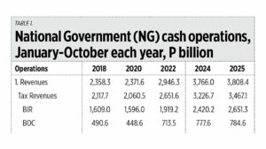 For the first 10 months of the year, our interest payments alone hit P295 billion in 2018 or an average of P1 billion a day, rising to P433 billion in 2022 or P1.4 billion a day, P2.1 billion a day in 2024 and P2.4 billion a day in 2025. This year, expenditures by the National Government (NG) are flat, and subsidies to GOCCs have declined, but transfers to LGUs and interest payments are rising, leading to a P1-trillion-plus budget deficit (see Table 1).