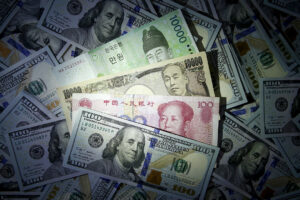 South Korean won, Chinese yuan and Japanese yen notes are seen on US 100 dollar notes in this file photo illustration. — REUTERS