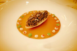 Next came her Le King Crabe, a navette tart of king crab and caviar and lobster jelly. This was paired with a Grand Bateau Bordeaux Blanc Sec 2023 (the joke that the wine’s name means “big boat” paired with a little boat-tart wasn’t lost on us). The flavors of the seafood were very much alive, but otherwise elegantly restrained and not jumping out of the plate. The pairing, softly fruity, enhanced the dish’s elegance.