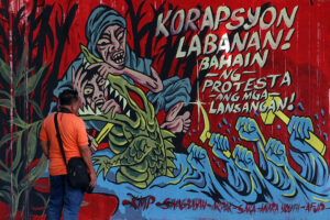 A MURAL depicts corrupt government officials involved in the anomalous flood control projects as crocodiles. — PHILIPPINE STAR/MIGUEL DE GUZMAN