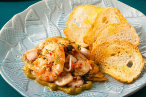 The first course, a Salpicon de Mariscos, has mussels, squid, and shrimp tossed in a light lemon vinaigrette with tomatoes, bell peppers, and onions. The effect is lacy, delicate, and tangy.