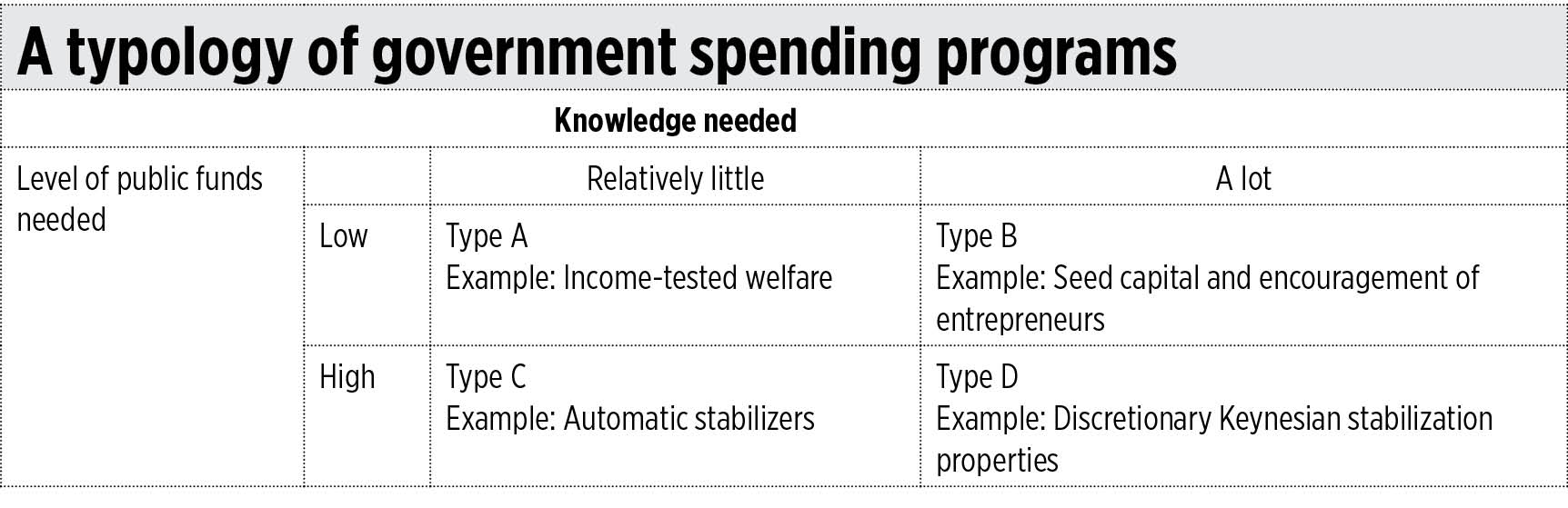 To explain our point better, we refer to a useful framework by Swedish economist Andreas Bergh. He classifies government programs along two dimensions: fiscal size and knowledge intensity (see the table). Programs that are large and knowledge-intensive are the riskiest. Programs that are large but knowledge-light — because they rely on decentralized decision-making — are likelier to succeed and be sustainable.